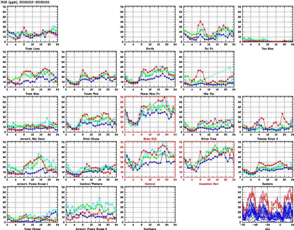 | Air Quality Data Time Series for NO2 (2018/10/15) | ( Line colors: Day -3 Day -2 Day -1 Current day ) | 2D Map Current AQHI |
