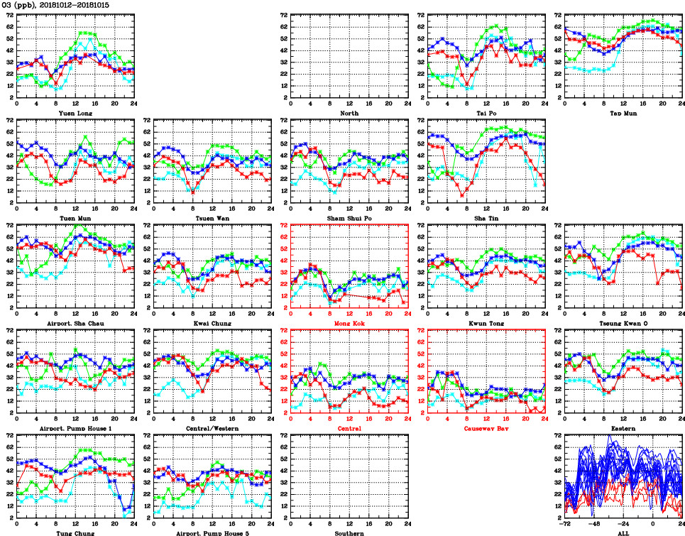| Air Quality Data Time Series for O3 (2018/10/15) | ( Line colors: Day -3 Day -2 Day -1 Current day ) | 2D Map Current AQHI |