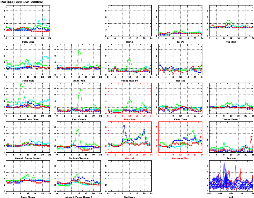 | Air Quality Data Time Series for SO2 (2018/10/12) | ( Line colors: Day -3 Day -2 Day -1 Current day ) | 2D Map Current AQHI |