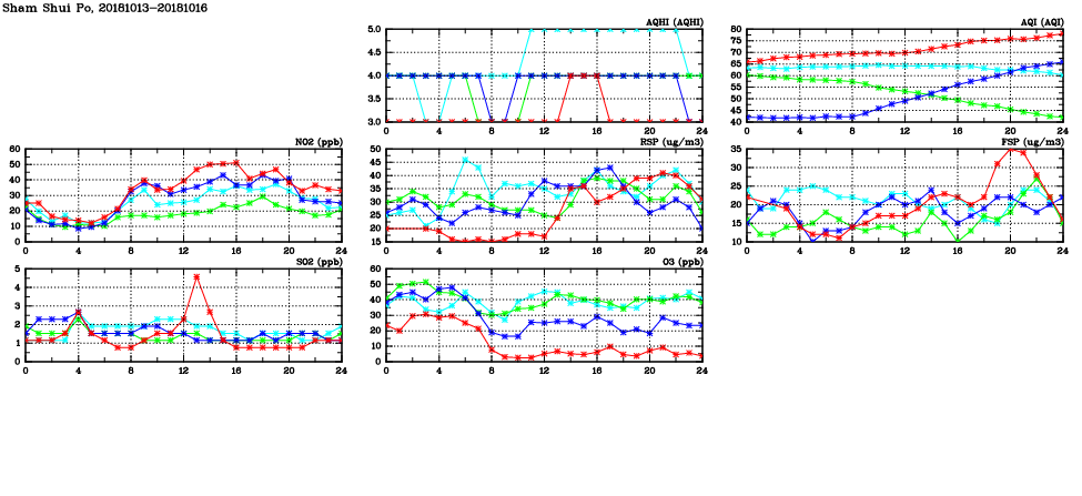 | Air Quality Data Time Series in Sham Shui Po (2018/10/16) | ( Line colors: Day -3 Day -2 Day -1 Current day ) | 2D Map Current AQHI |