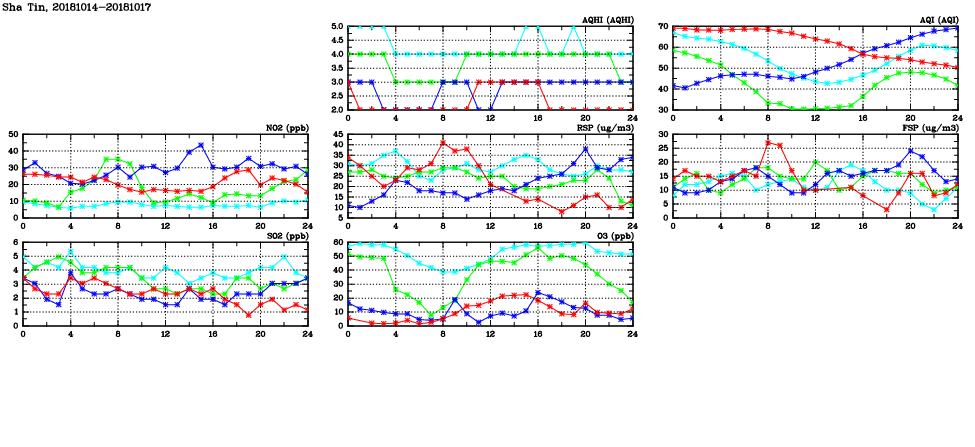 | Air Quality Data Time Series in Sha Tin (2018/10/17) | ( Line colors: Day -3 Day -2 Day -1 Current day ) | 2D Map Current AQHI |