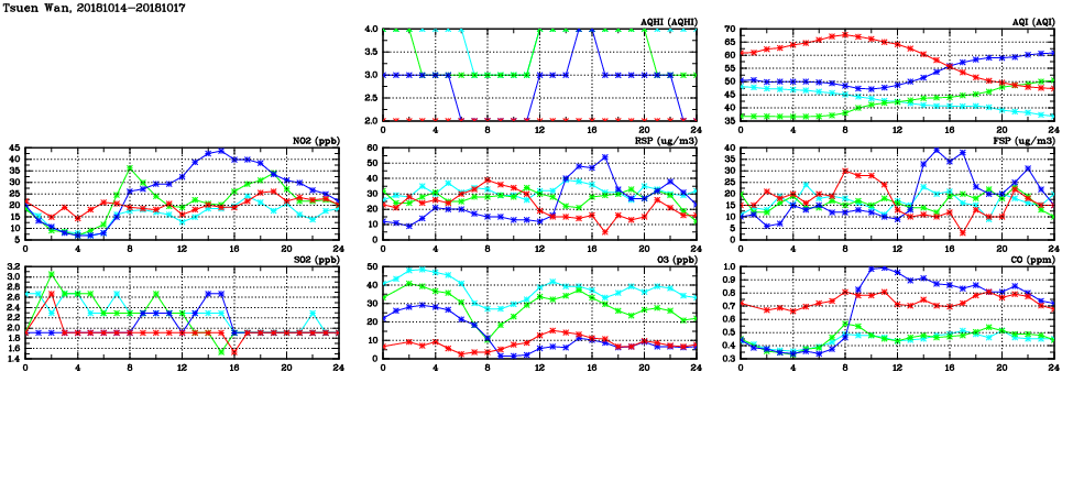 | Air Quality Data Time Series in Tsuen Wan (2018/10/17) | ( Line colors: Day -3 Day -2 Day -1 Current day ) | 2D Map Current AQHI |