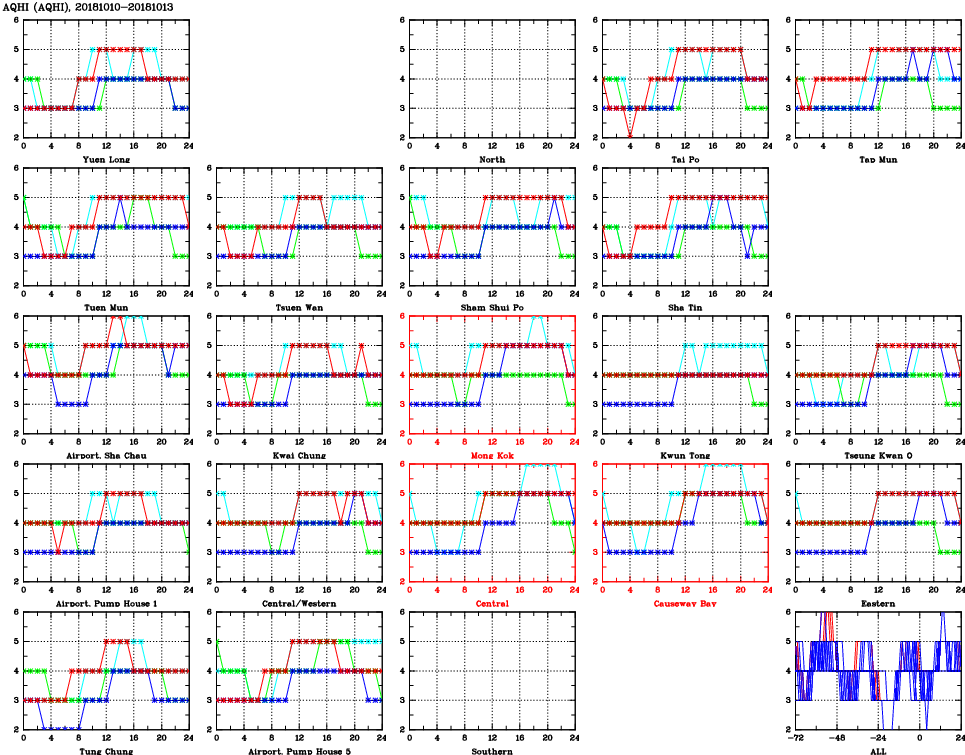 | Air Quality Data Time Series for AQHI (2018/10/13) | ( Line colors: Day -3 Day -2 Day -1 Current day ) | 2D Map Current AQHI |