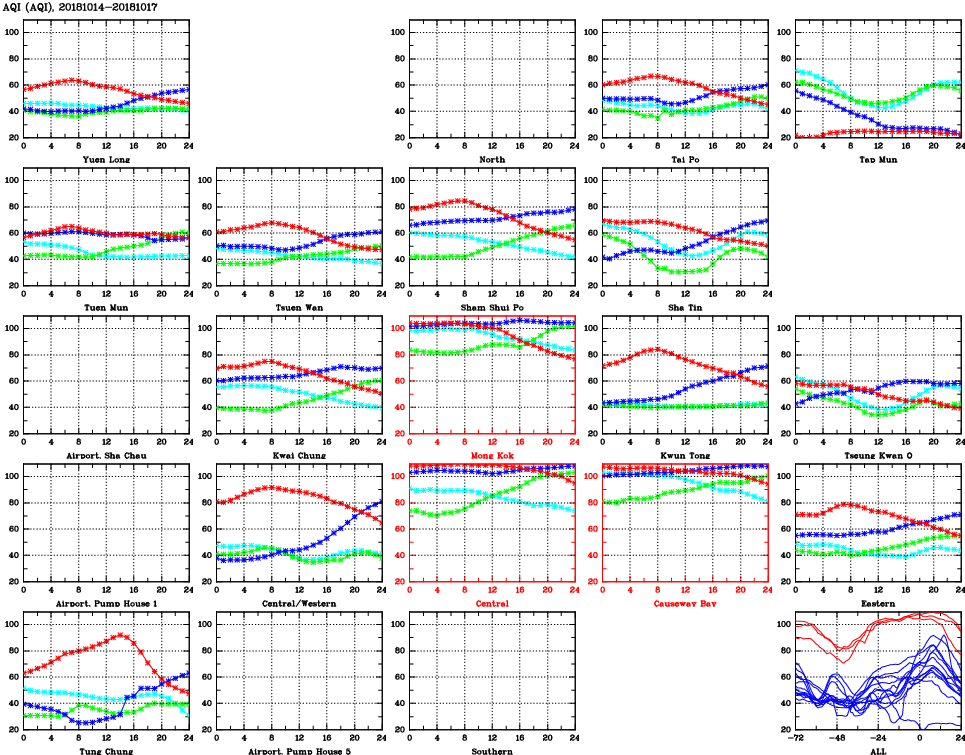 | Air Quality Data Time Series for AQI (2018/10/17) | ( Line colors: Day -3 Day -2 Day -1 Current day ) | 2D Map Current AQHI |
