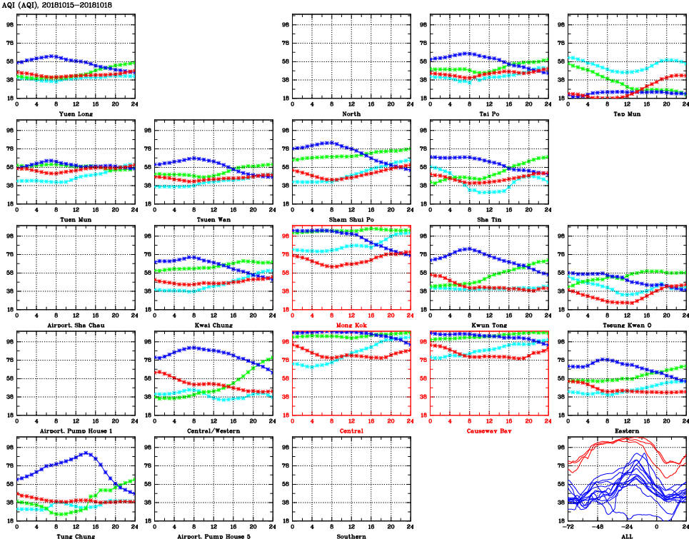 | Air Quality Data Time Series for AQI (2018/10/18) | ( Line colors: Day -3 Day -2 Day -1 Current day ) | 2D Map Current AQHI |