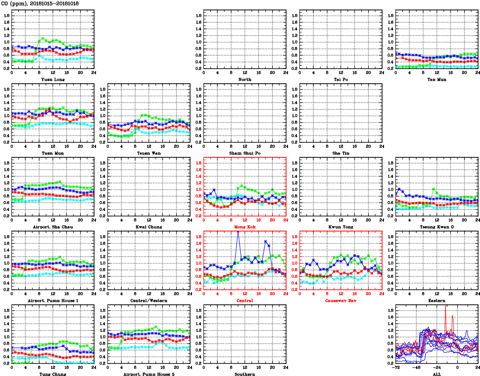 | Air Quality Data Time Series for CO (2018/10/18) | ( Line colors: Day -3 Day -2 Day -1 Current day ) | 2D Map Current AQHI |