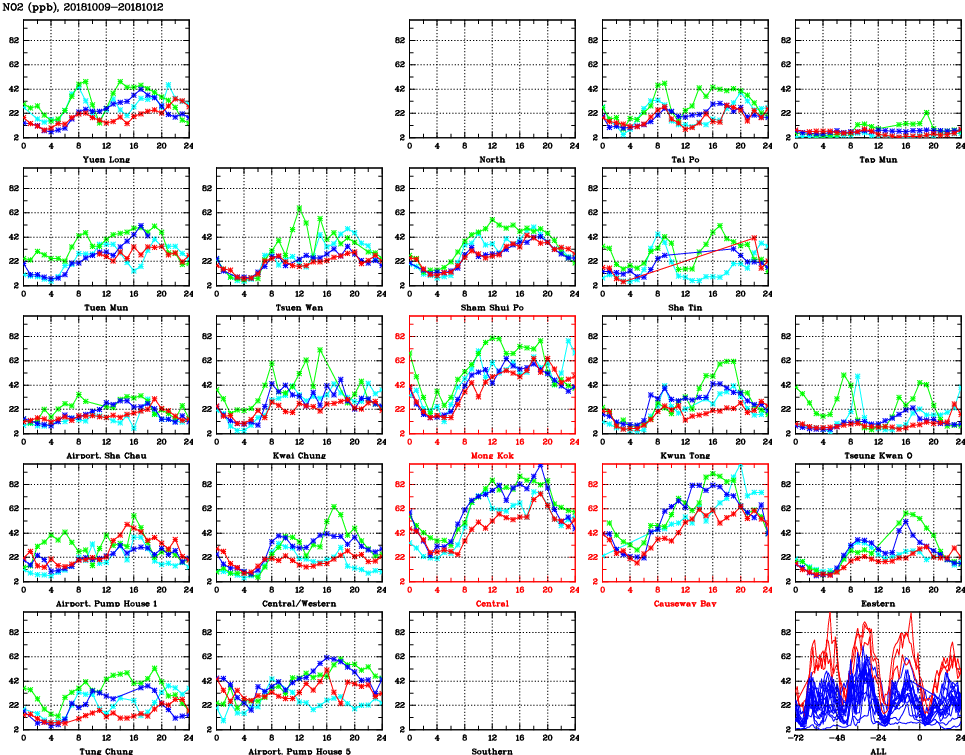 | Air Quality Data Time Series for NO2 (2018/10/12) | ( Line colors: Day -3 Day -2 Day -1 Current day ) | 2D Map Current AQHI |