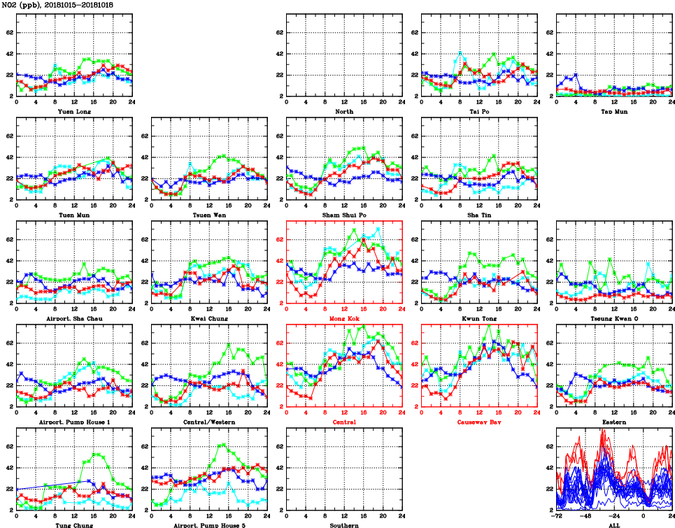 | Air Quality Data Time Series for NO2 (2018/10/18) | ( Line colors: Day -3 Day -2 Day -1 Current day ) | 2D Map Current AQHI |