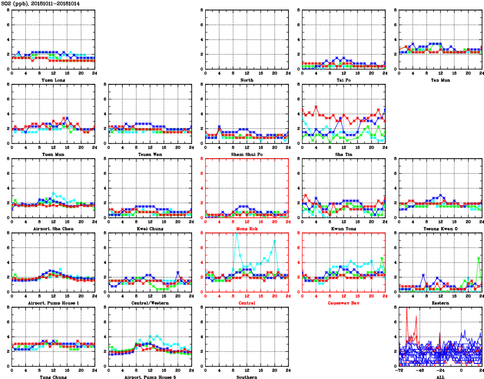 | Air Quality Data Time Series for SO2 (2018/10/14) | ( Line colors: Day -3 Day -2 Day -1 Current day ) | 2D Map Current AQHI |