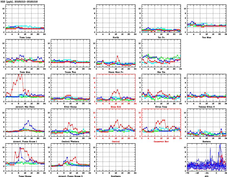 | Air Quality Data Time Series for SO2 (2018/10/16) | ( Line colors: Day -3 Day -2 Day -1 Current day ) | 2D Map Current AQHI |