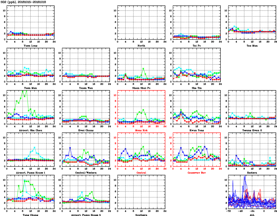 | Air Quality Data Time Series for SO2 (2018/10/18) | ( Line colors: Day -3 Day -2 Day -1 Current day ) | 2D Map Current AQHI |