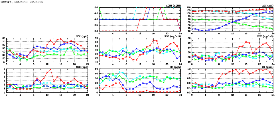 | Air Quality Data Time Series in Central (2018/10/16) | ( Line colors: Day -3 Day -2 Day -1 Current day ) | 2D Map Current AQHI |