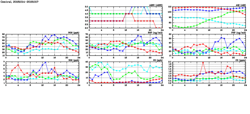 | Air Quality Data Time Series in Central (2018/10/17) | ( Line colors: Day -3 Day -2 Day -1 Current day ) | 2D Map Current AQHI |