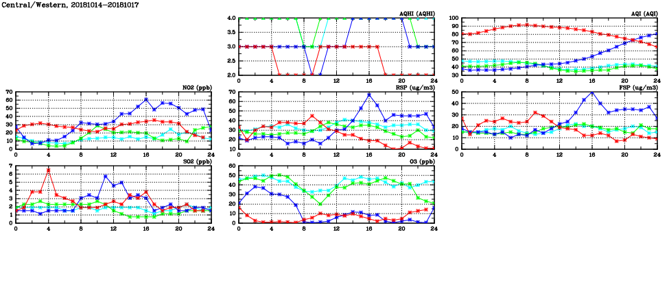 | Air Quality Data Time Series in Central/Western (2018/10/17) | ( Line colors: Day -3 Day -2 Day -1 Current day ) | 2D Map Current AQHI |