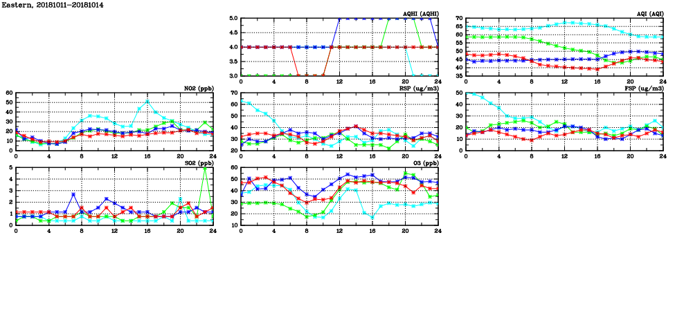 | Air Quality Data Time Series in Eastern (2018/10/14) | ( Line colors: Day -3 Day -2 Day -1 Current day ) | 2D Map Current AQHI |