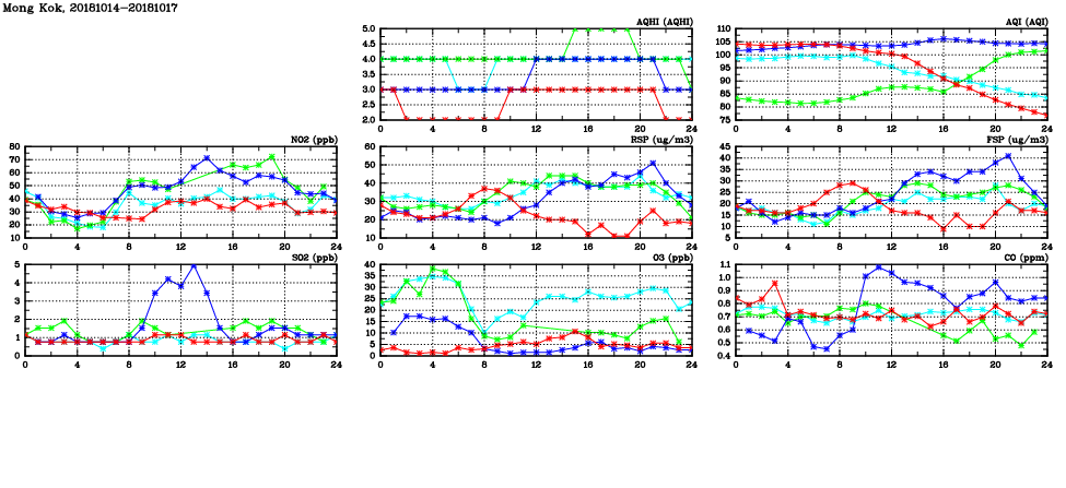 | Air Quality Data Time Series in Mong Kok (2018/10/17) | ( Line colors: Day -3 Day -2 Day -1 Current day ) | 2D Map Current AQHI |