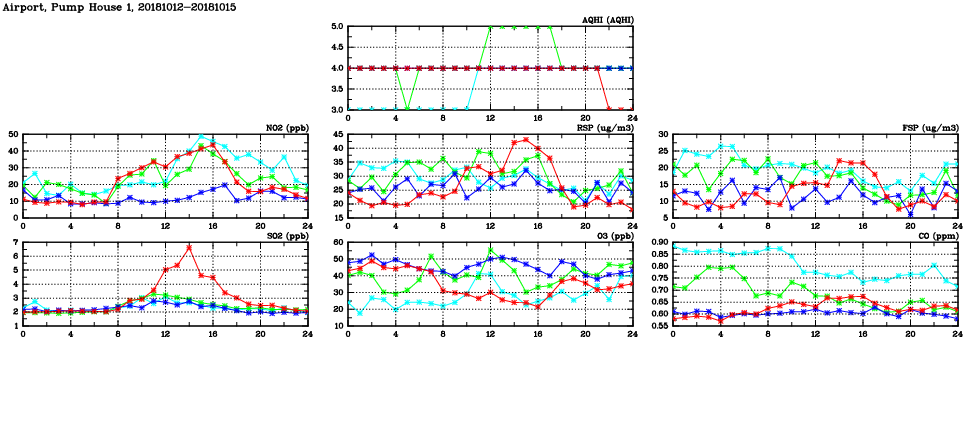 | Air Quality Data Time Series in Airport, Pump House 1 (2018/10/15) | ( Line colors: Day -3 Day -2 Day -1 Current day ) | 2D Map Current AQHI |