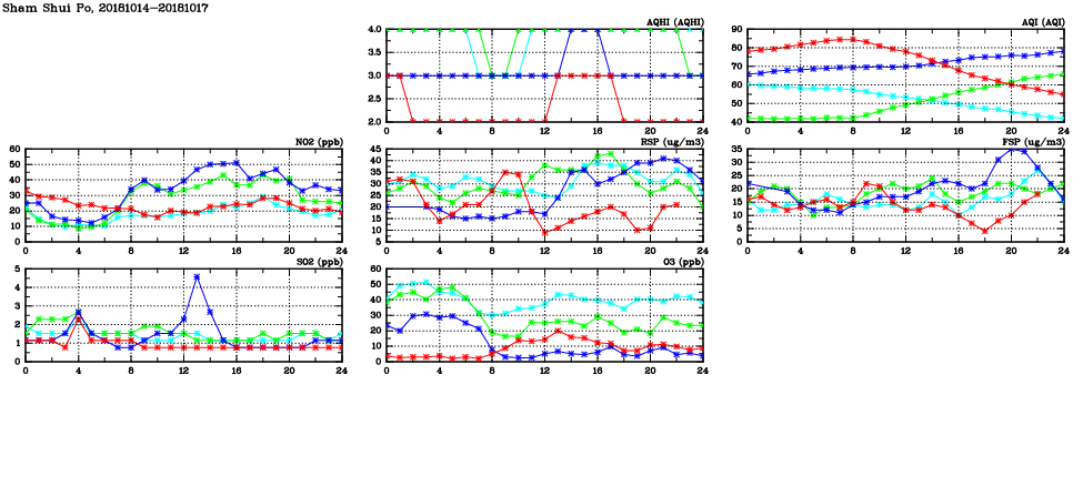 Air Quality Data Time Series in Sham Shui Po (2018/10/17) ( Line colors: Day -3 Day -2 Day -1 Current day ) 2D Map   Current AQHI