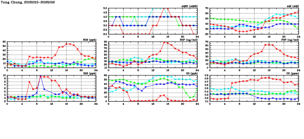 | Air Quality Data Time Series in Tung Chung (2018/10/16) | ( Line colors: Day -3 Day -2 Day -1 Current day ) | 2D Map Current AQHI |