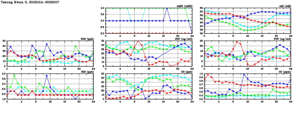 | Air Quality Data Time Series in Tseung Kwan O (2018/10/17) | ( Line colors: Day -3 Day -2 Day -1 Current day ) | 2D Map Current AQHI |