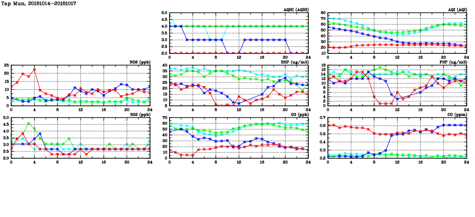 | Air Quality Data Time Series in Tap Mun (2018/10/17) | ( Line colors: Day -3 Day -2 Day -1 Current day ) | 2D Map Current AQHI |