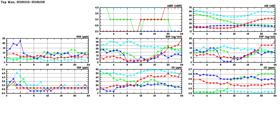 | Air Quality Data Time Series in Tap Mun (2018/10/18) | ( Line colors: Day -3 Day -2 Day -1 Current day ) | 2D Map Current AQHI |