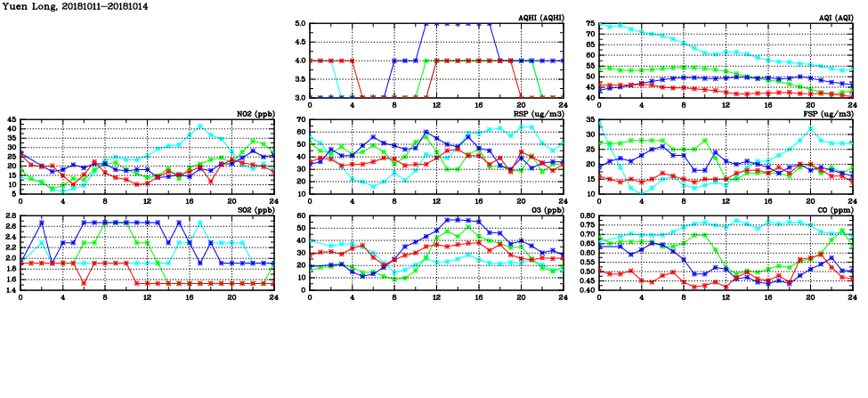 | Air Quality Data Time Series in Yuen Long (2018/10/14) | ( Line colors: Day -3 Day -2 Day -1 Current day ) | 2D Map Current AQHI |