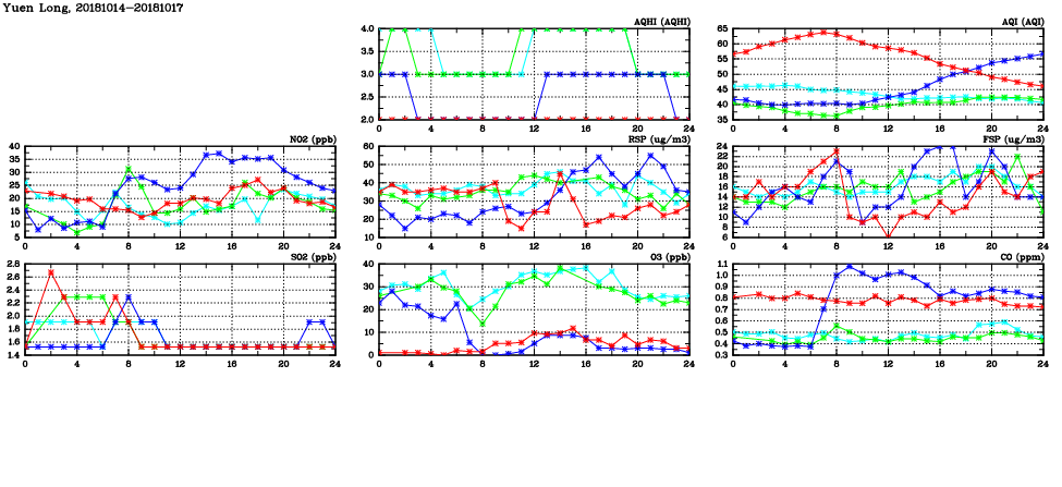 | Air Quality Data Time Series in Yuen Long (2018/10/17) | ( Line colors: Day -3 Day -2 Day -1 Current day ) | 2D Map Current AQHI |