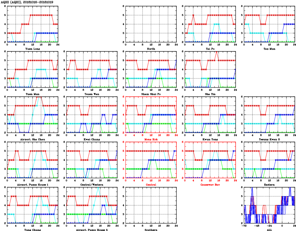 | Air Quality Data Time Series for AQHI (2018/10/19) | ( Line colors: Day -3 Day -2 Day -1 Current day ) | 2D Map Current AQHI |