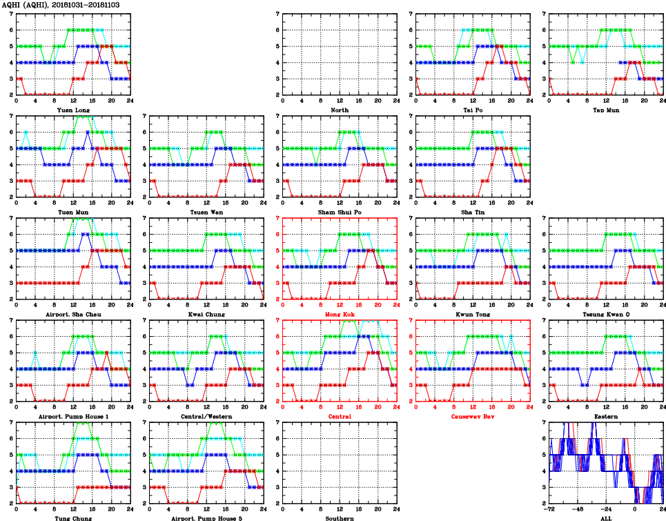 | Air Quality Data Time Series for AQHI (2018/11/03) | ( Line colors: Day -3 Day -2 Day -1 Current day ) | 2D Map Current AQHI |