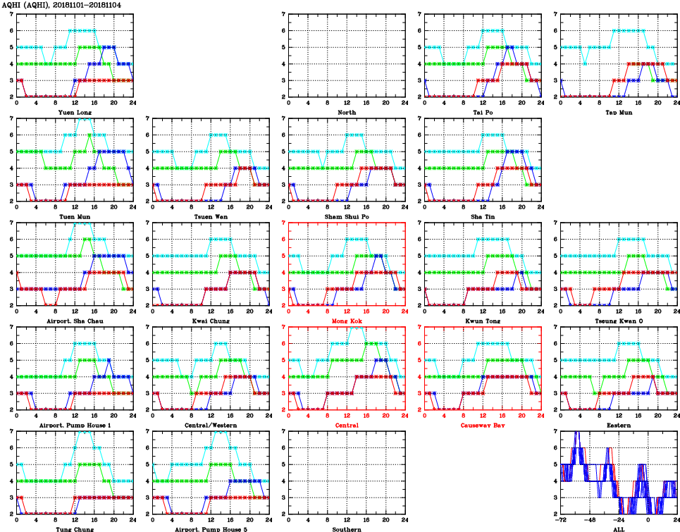 | Air Quality Data Time Series for AQHI (2018/11/04) | ( Line colors: Day -3 Day -2 Day -1 Current day ) | 2D Map Current AQHI |