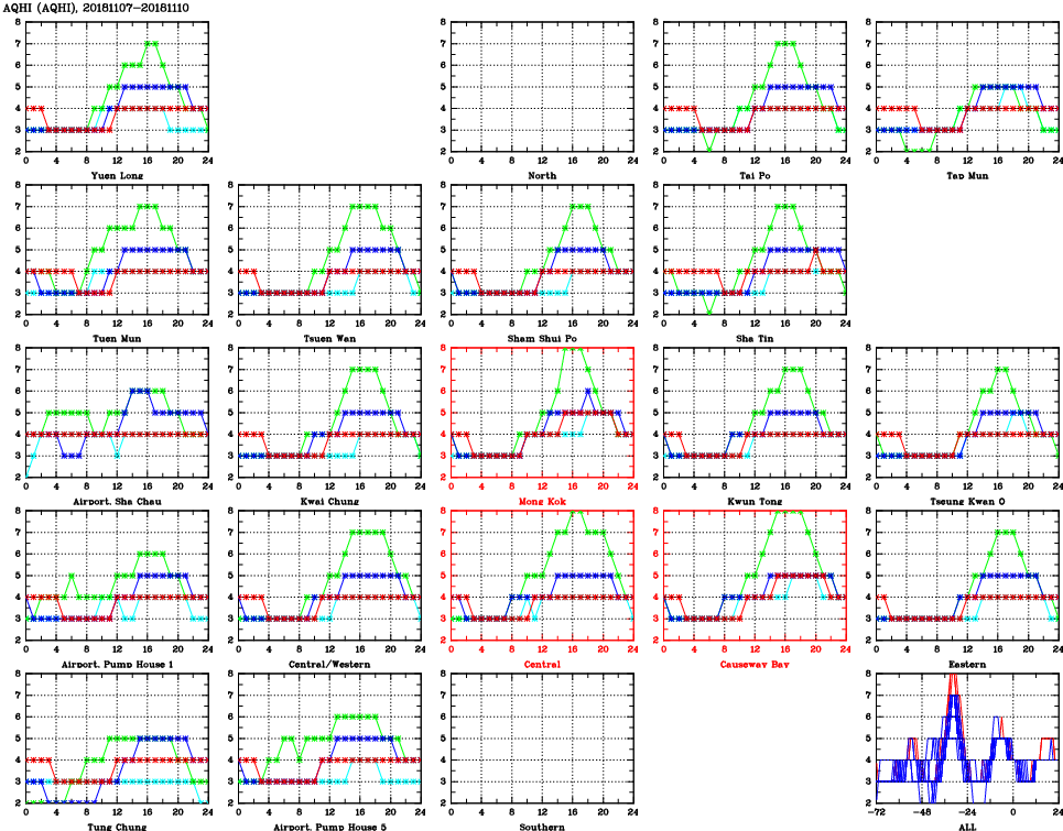 | Air Quality Data Time Series for AQHI (2018/11/10) | ( Line colors: Day -3 Day -2 Day -1 Current day ) | 2D Map Current AQHI |