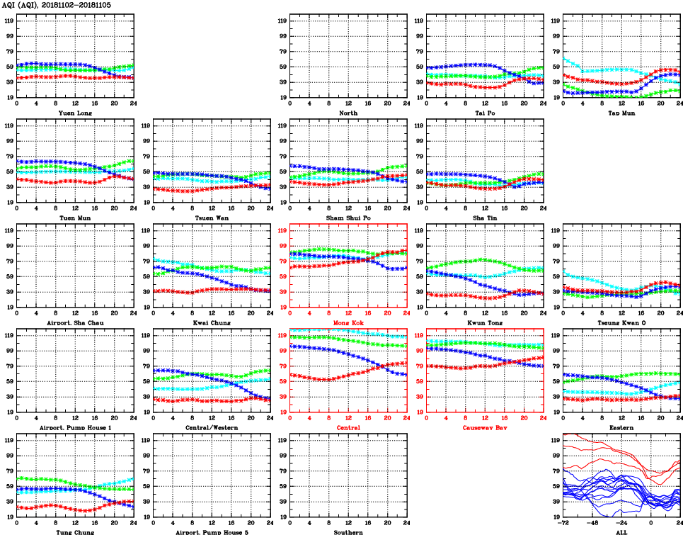 | Air Quality Data Time Series for AQI (2018/11/05) | ( Line colors: Day -3 Day -2 Day -1 Current day ) | 2D Map Current AQHI |