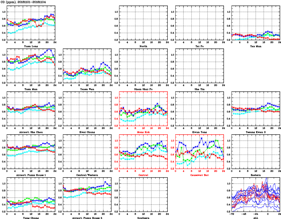| Air Quality Data Time Series for CO (2018/11/04) | ( Line colors: Day -3 Day -2 Day -1 Current day ) | 2D Map Current AQHI |