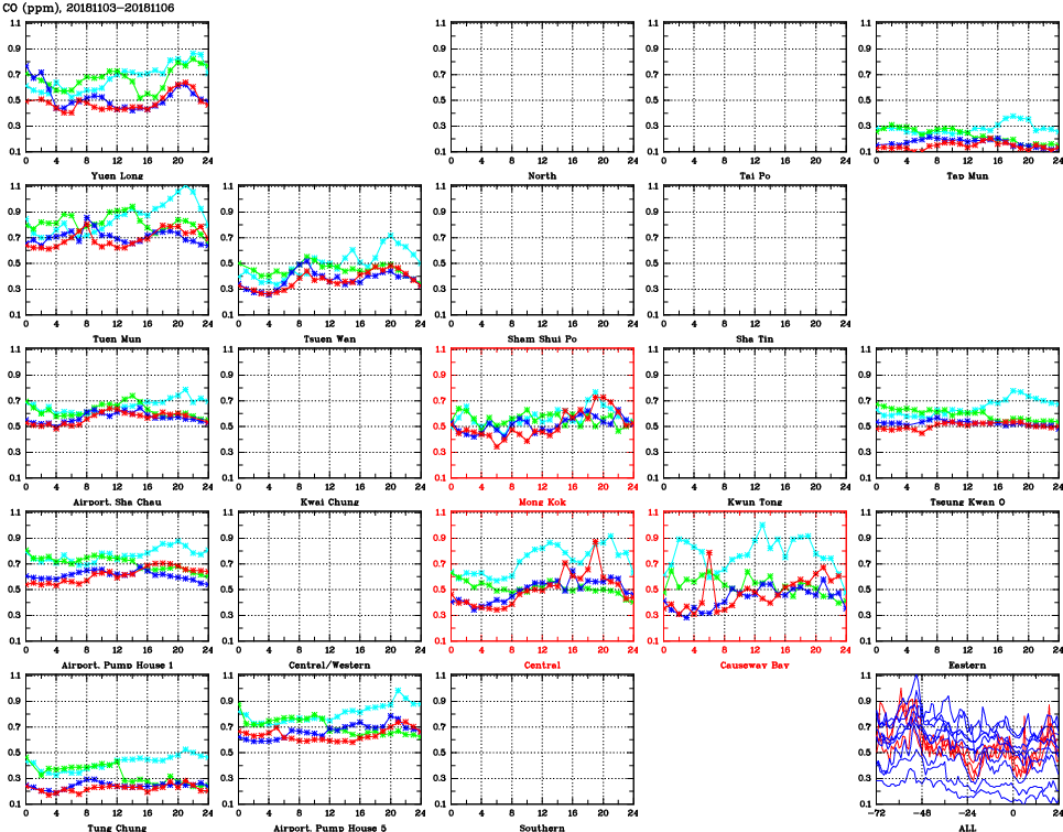 | Air Quality Data Time Series for CO (2018/11/06) | ( Line colors: Day -3 Day -2 Day -1 Current day ) | 2D Map Current AQHI |