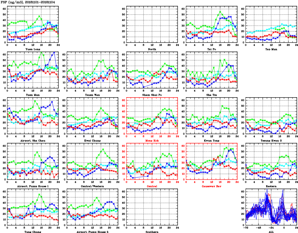 | Air Quality Data Time Series for FSP (2018/11/04) | ( Line colors: Day -3 Day -2 Day -1 Current day ) | 2D Map Current AQHI |