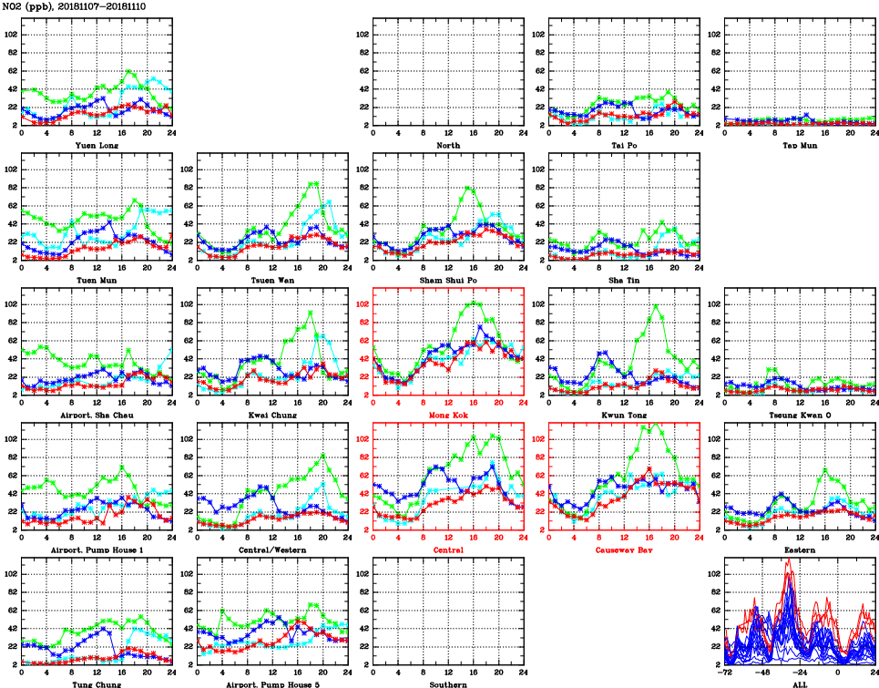 | Air Quality Data Time Series for NO2 (2018/11/10) | ( Line colors: Day -3 Day -2 Day -1 Current day ) | 2D Map Current AQHI |