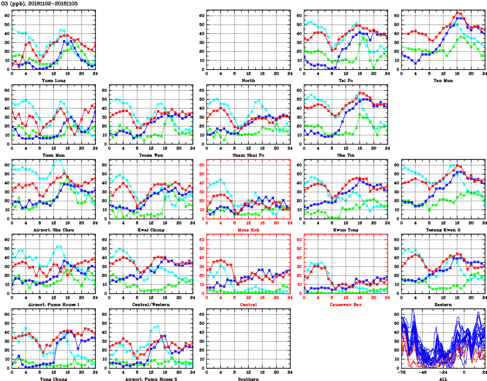 | Air Quality Data Time Series for O3 (2018/11/05) | ( Line colors: Day -3 Day -2 Day -1 Current day ) | 2D Map Current AQHI |