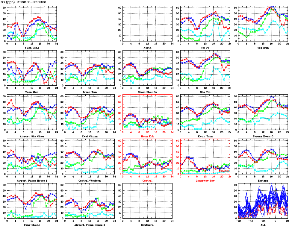 | Air Quality Data Time Series for O3 (2018/11/06) | ( Line colors: Day -3 Day -2 Day -1 Current day ) | 2D Map Current AQHI |