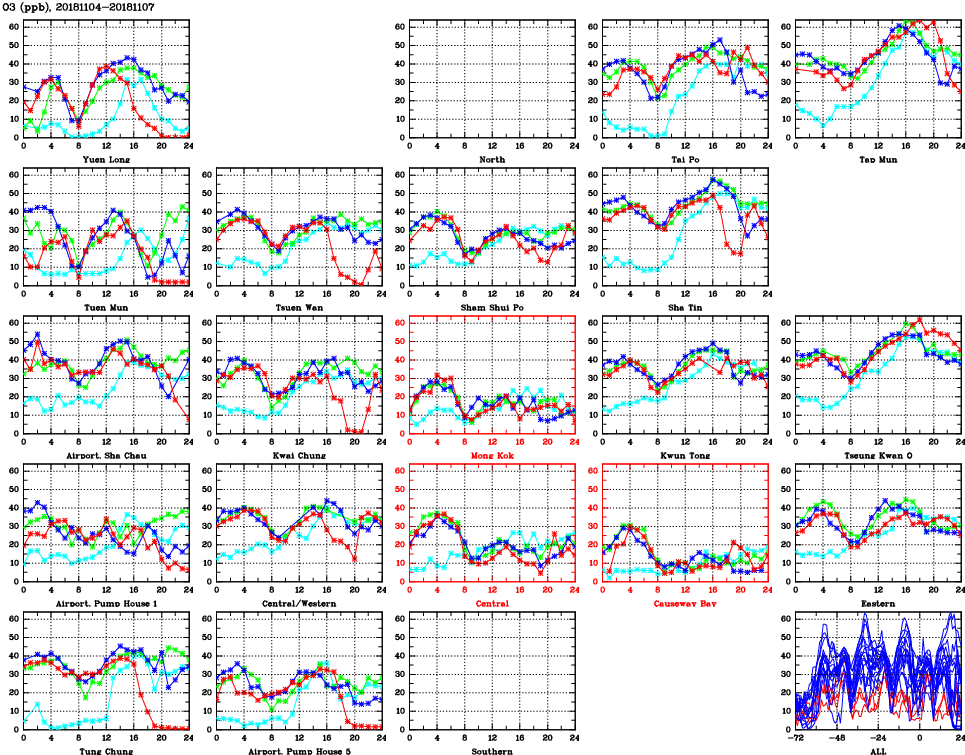 | Air Quality Data Time Series for O3 (2018/11/07) | ( Line colors: Day -3 Day -2 Day -1 Current day ) | 2D Map Current AQHI |
