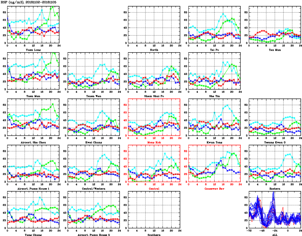 | Air Quality Data Time Series for RSP (2018/11/05) | ( Line colors: Day -3 Day -2 Day -1 Current day ) | 2D Map Current AQHI |