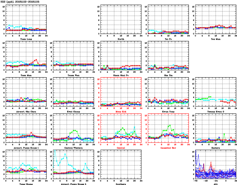 | Air Quality Data Time Series for SO2 (2018/11/05) | ( Line colors: Day -3 Day -2 Day -1 Current day ) | 2D Map Current AQHI |