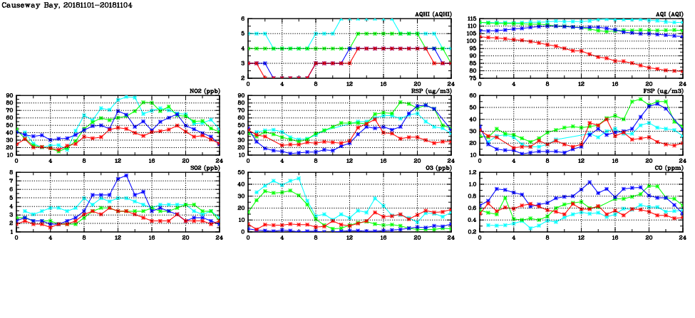 | Air Quality Data Time Series in Causeway Bay (2018/11/04) | ( Line colors: Day -3 Day -2 Day -1 Current day ) | 2D Map Current AQHI |