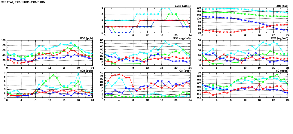 | Air Quality Data Time Series in Central (2018/11/05) | ( Line colors: Day -3 Day -2 Day -1 Current day ) | 2D Map Current AQHI |