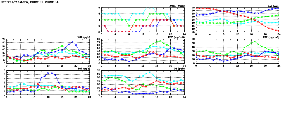 | Air Quality Data Time Series in Central/Western (2018/11/04) | ( Line colors: Day -3 Day -2 Day -1 Current day ) | 2D Map Current AQHI |