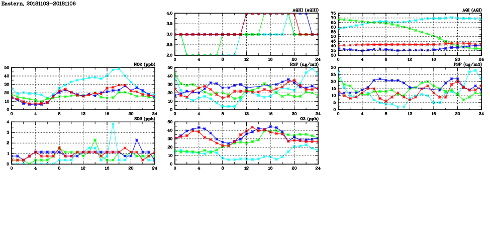 | Air Quality Data Time Series in Eastern (2018/11/06) | ( Line colors: Day -3 Day -2 Day -1 Current day ) | 2D Map Current AQHI |