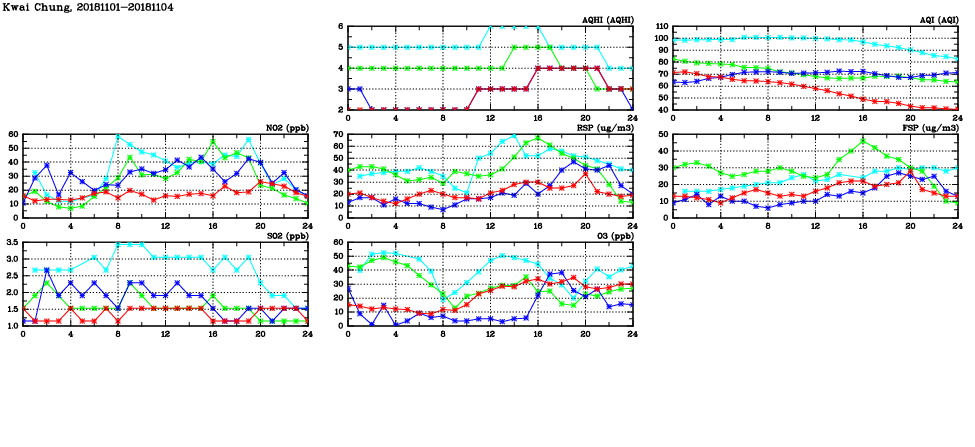 | Air Quality Data Time Series in Kwai Chung (2018/11/04) | ( Line colors: Day -3 Day -2 Day -1 Current day ) | 2D Map Current AQHI |