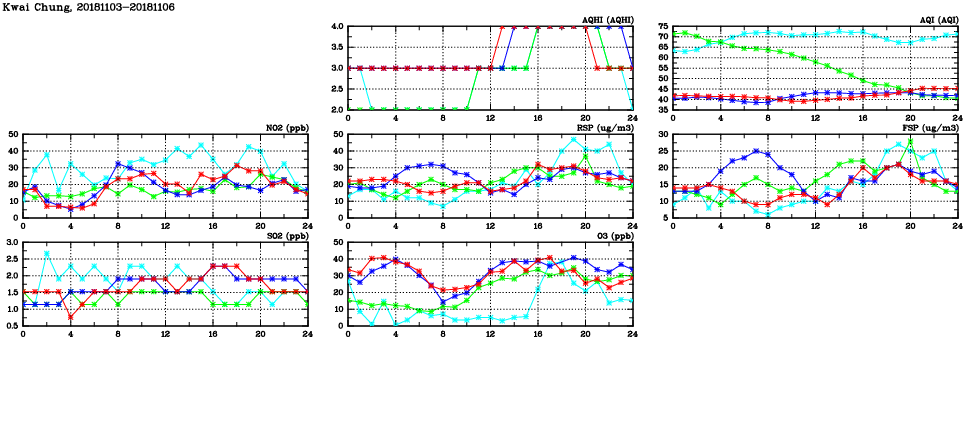 | Air Quality Data Time Series in Kwai Chung (2018/11/06) | ( Line colors: Day -3 Day -2 Day -1 Current day ) | 2D Map Current AQHI |