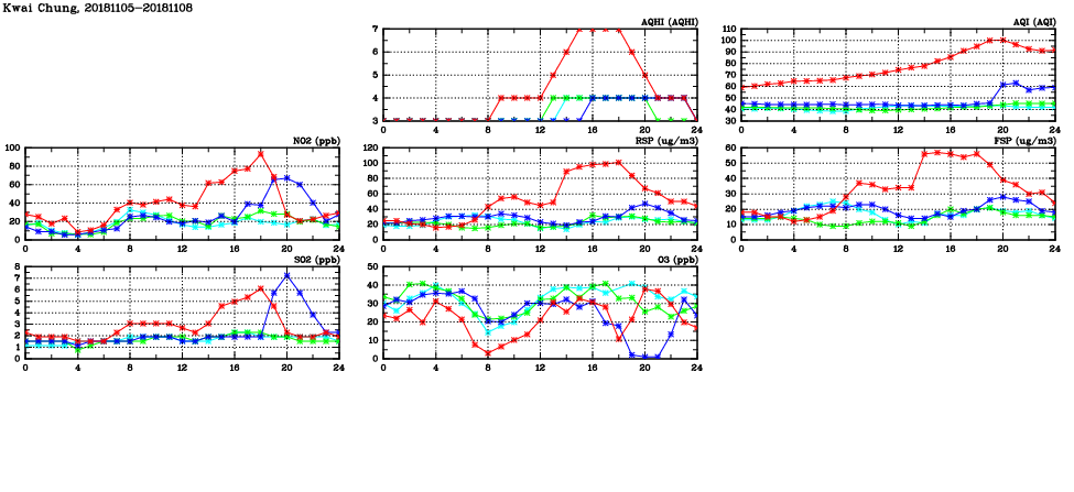 | Air Quality Data Time Series in Kwai Chung (2018/11/08) | ( Line colors: Day -3 Day -2 Day -1 Current day ) | 2D Map Current AQHI |