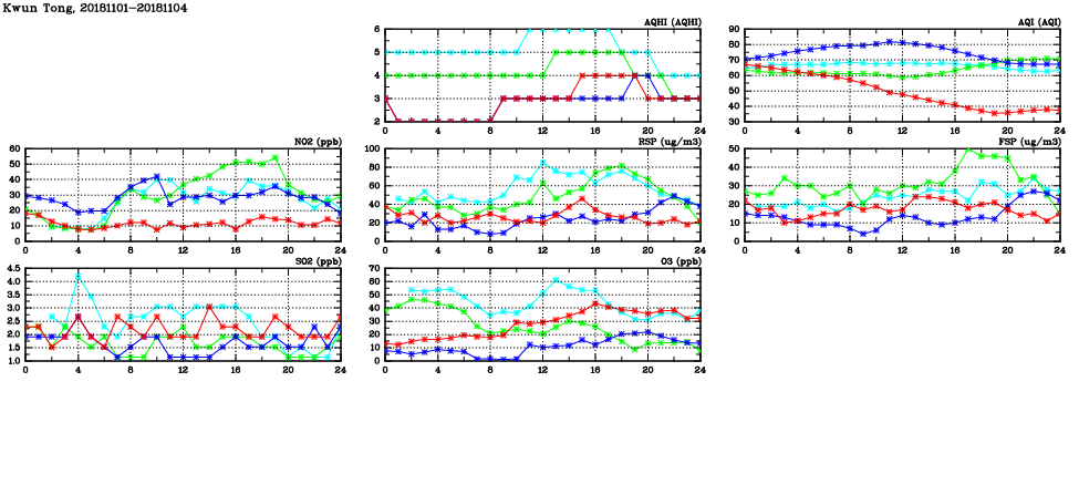 | Air Quality Data Time Series in Kwun Tong (2018/11/04) | ( Line colors: Day -3 Day -2 Day -1 Current day ) | 2D Map Current AQHI |